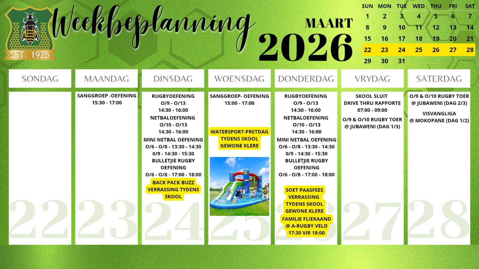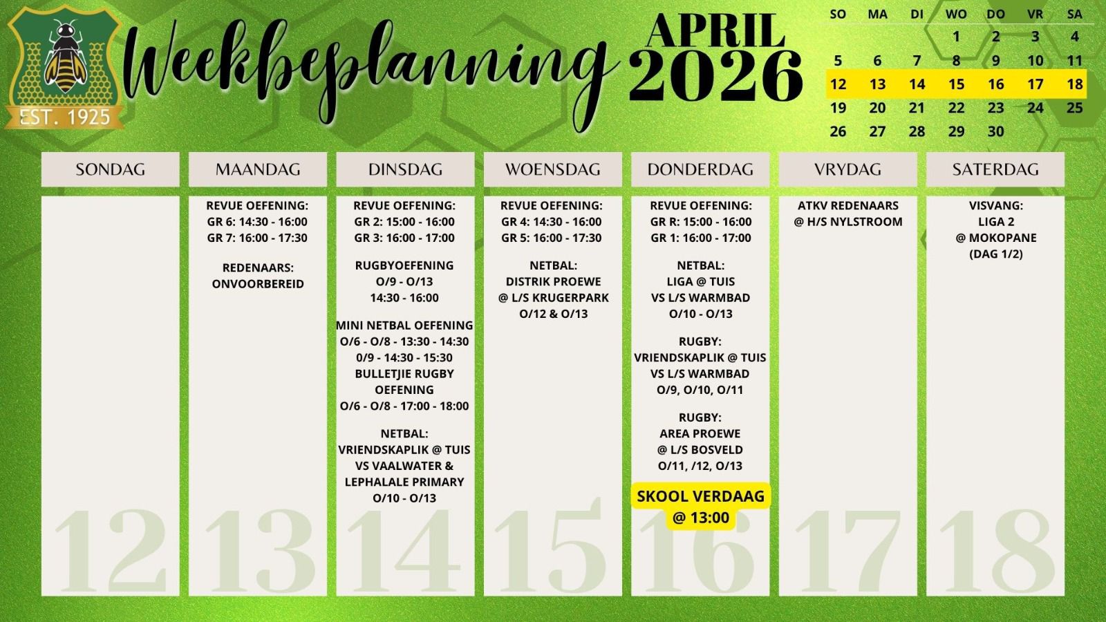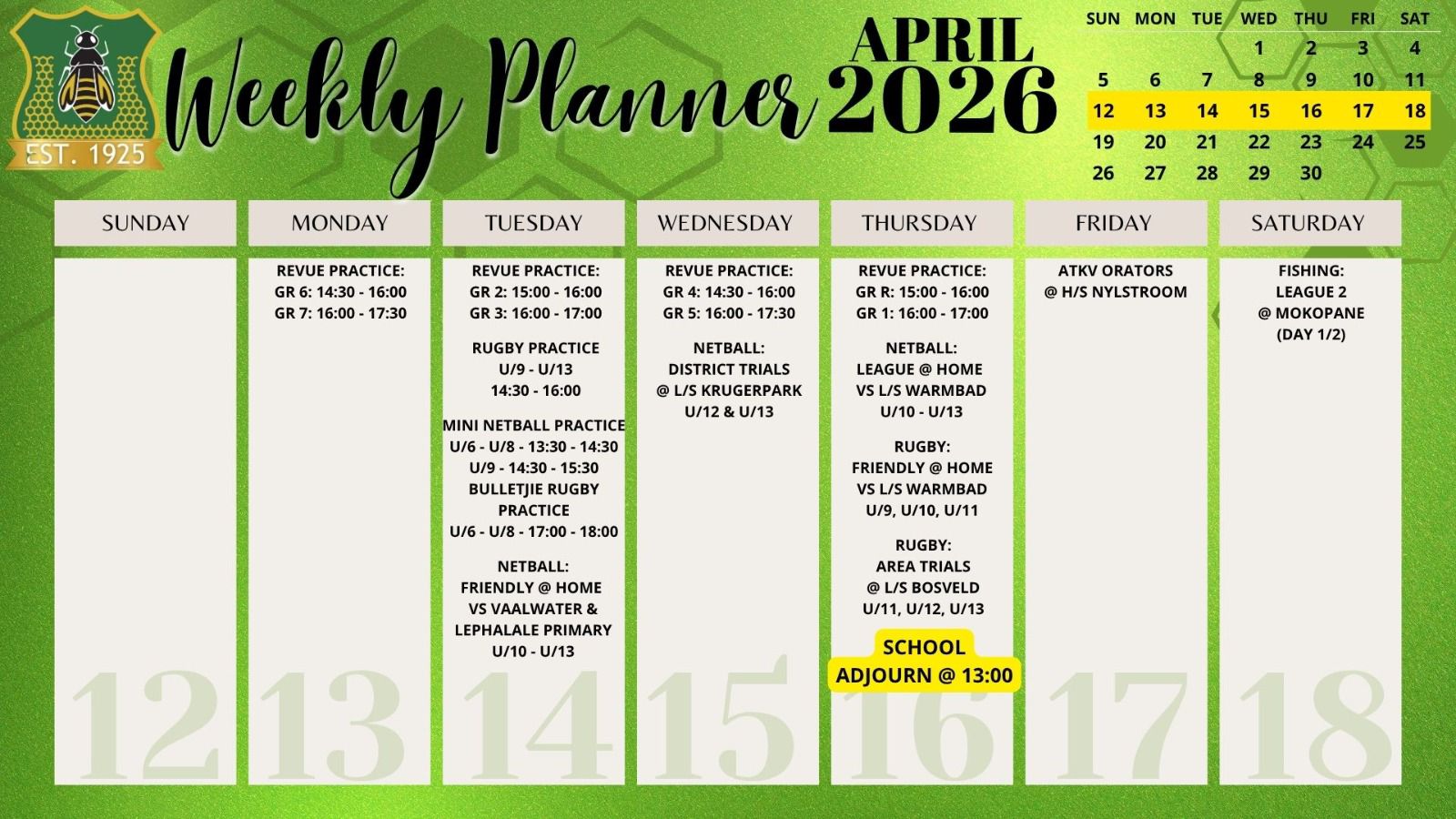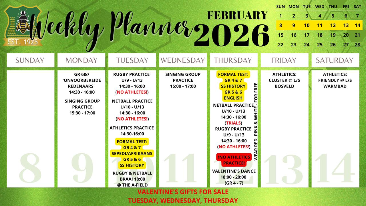 Laerskool Ellisras, a school driven by values. Where children can walk barefoot, and where the sound of the falling Marula’s are in our roots. At Laerskool Ellisras we ensure that each child maintains a healthy balance between academics,sport and culture. Where children have space to grow, to develop and to really LIVE. On these grounds our learners use silent endevor to achieve great heights.