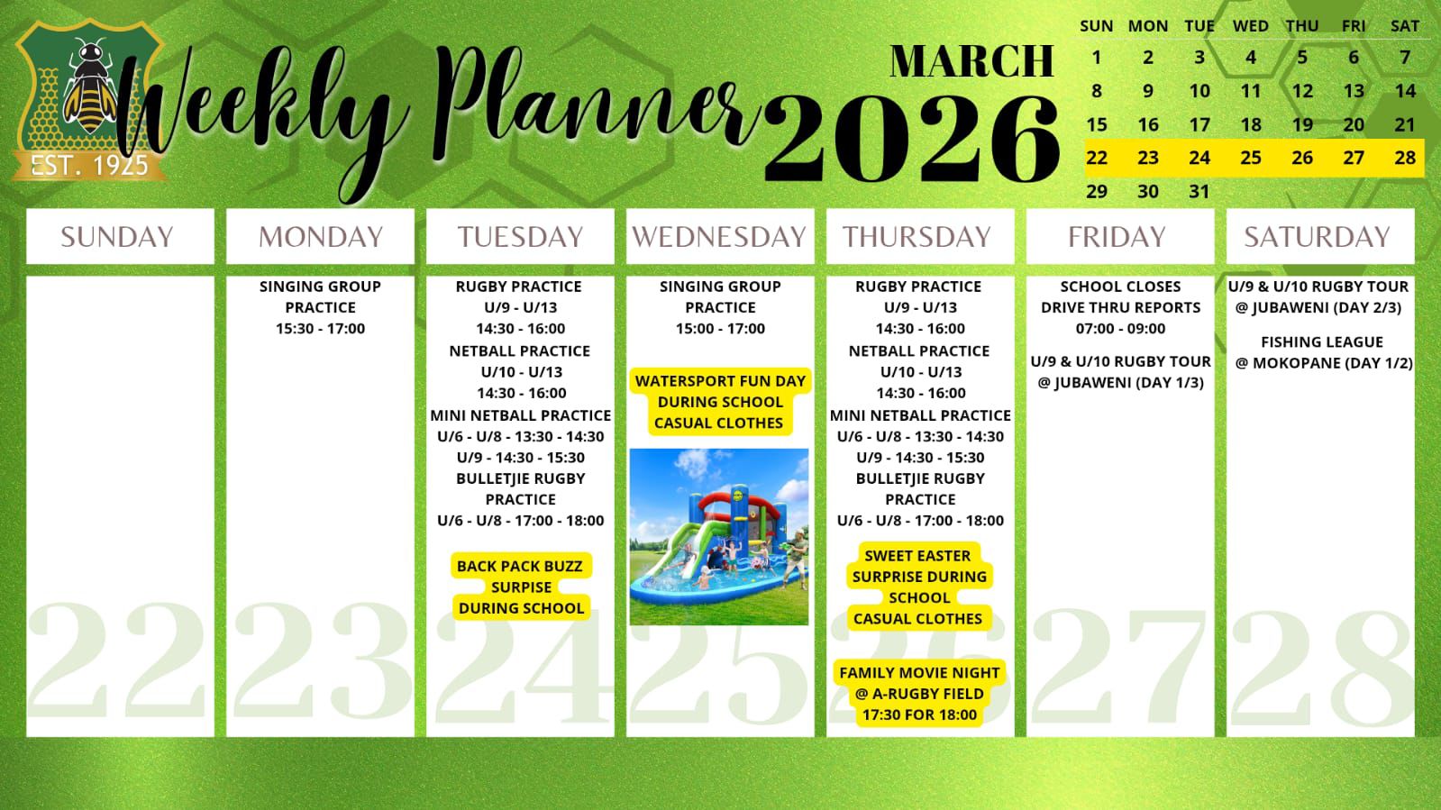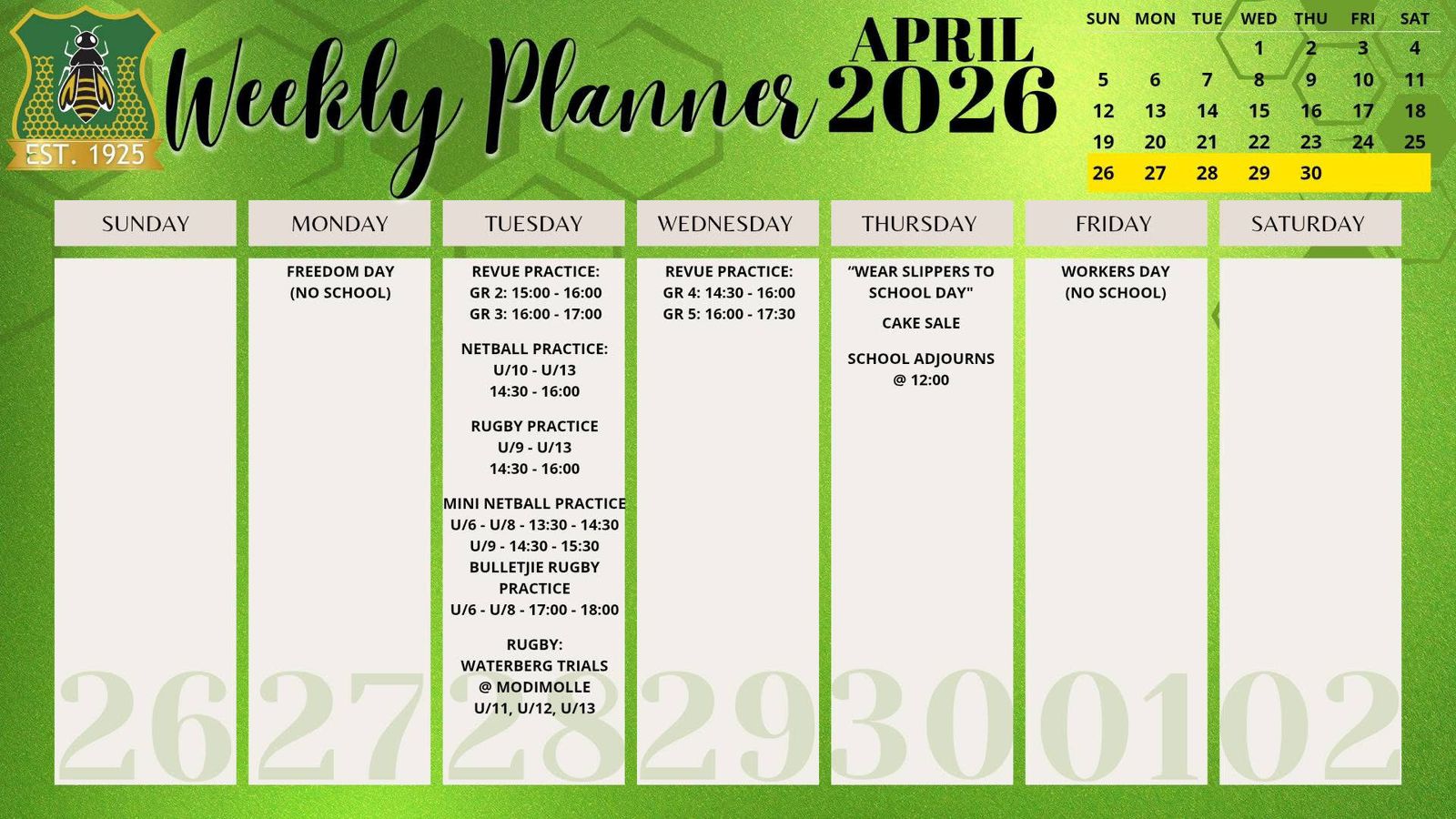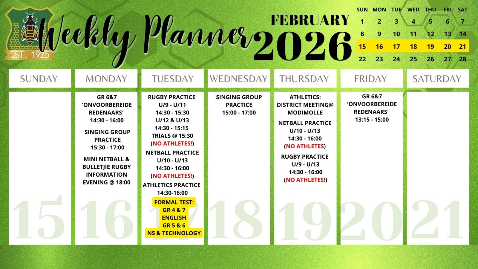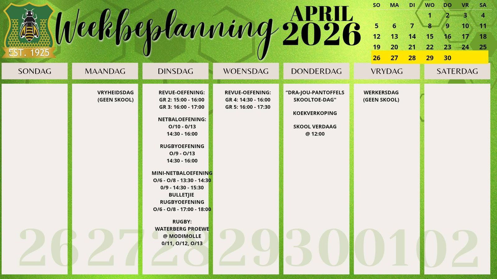 Laerskool Ellisras, a school driven by values. Where children can walk barefoot, and where the sound of the falling Marula’s are in our roots. At Laerskool Ellisras we ensure that each child maintains a healthy balance between academics,sport and culture. Where children have space to grow, to develop and to really LIVE. On these grounds our learners use silent endevor to achieve great heights.